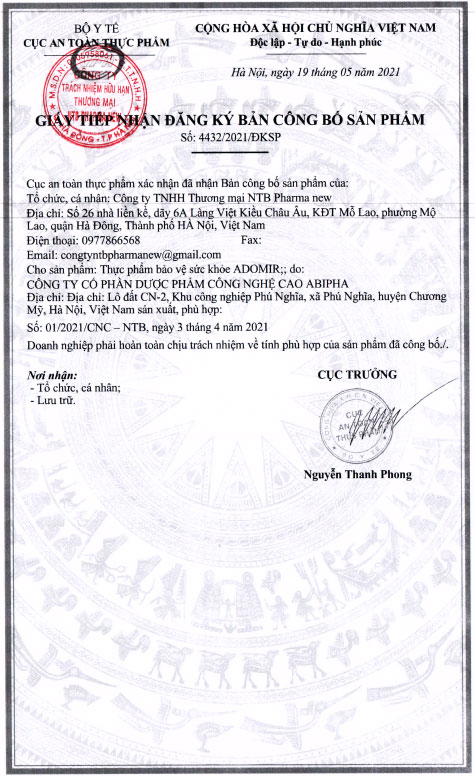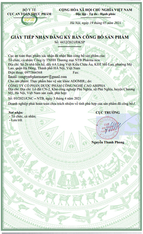 Giấy tiếp nhận đăng ký bản công bố sản phẩm